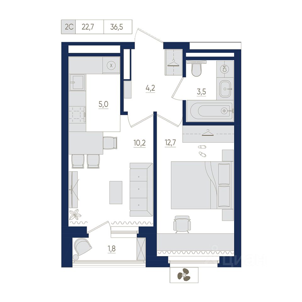 12-й этаж 22 - этажного жилого дома, общая площадь 36.5 кв. м., жилая площадь 22.9 кв. м. Срок окончания строительства: 2 квартал 2026 года
