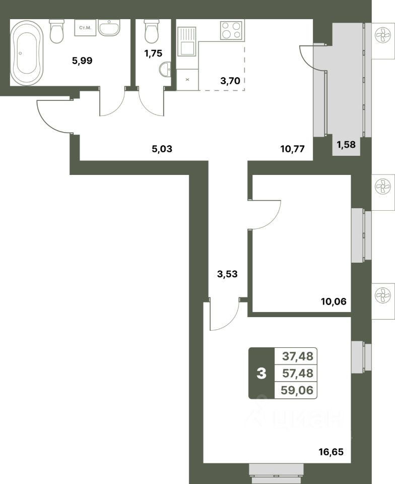 Продается 3-к-комнатная квартира в ЖК "Свой Берег" от ГК "Архстрой Групп". 3-й этаж 8-этажного жилого дома, общая площадь 59.06 кв.м., жилая площадь 37.48 кв.м. Отделка получистовая.