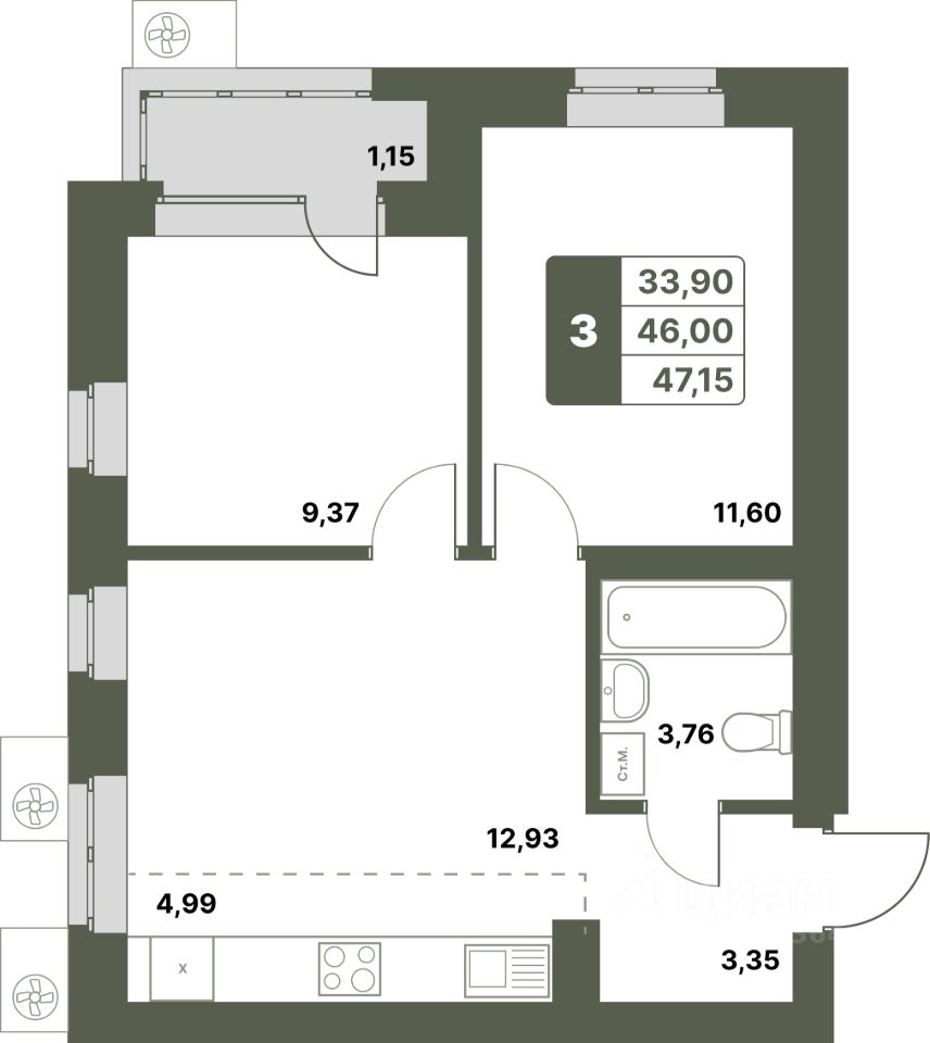 Продается 3-к-комнатная квартира в ЖК "Свой Берег" от ГК "Архстрой Групп". 6-й этаж 8-этажного жилого дома, общая площадь 47.15 кв.м., жилая площадь 33.9 кв.м. Отделка получистовая.
