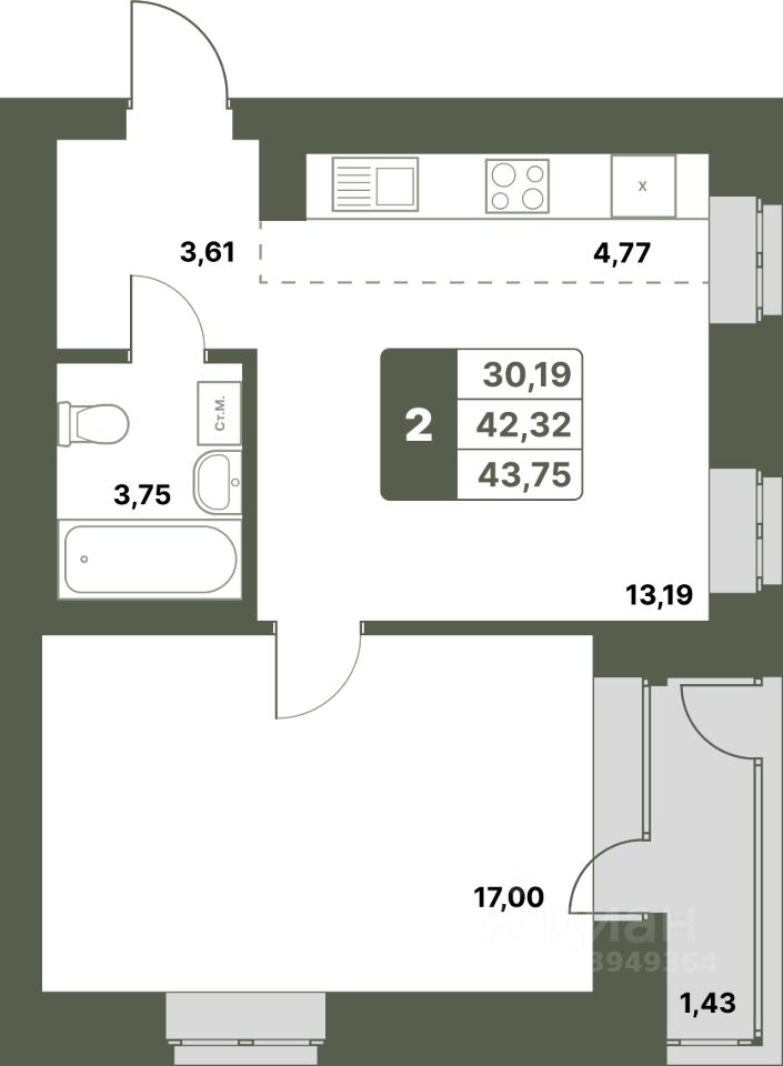 43,75 м²