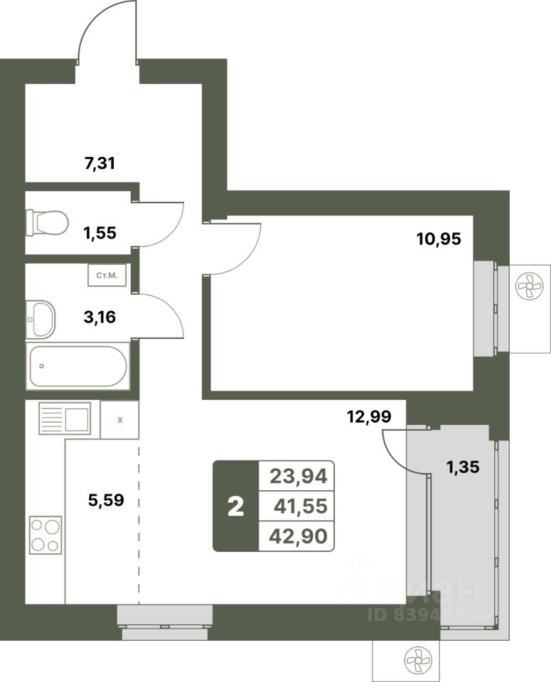 42,9 м²