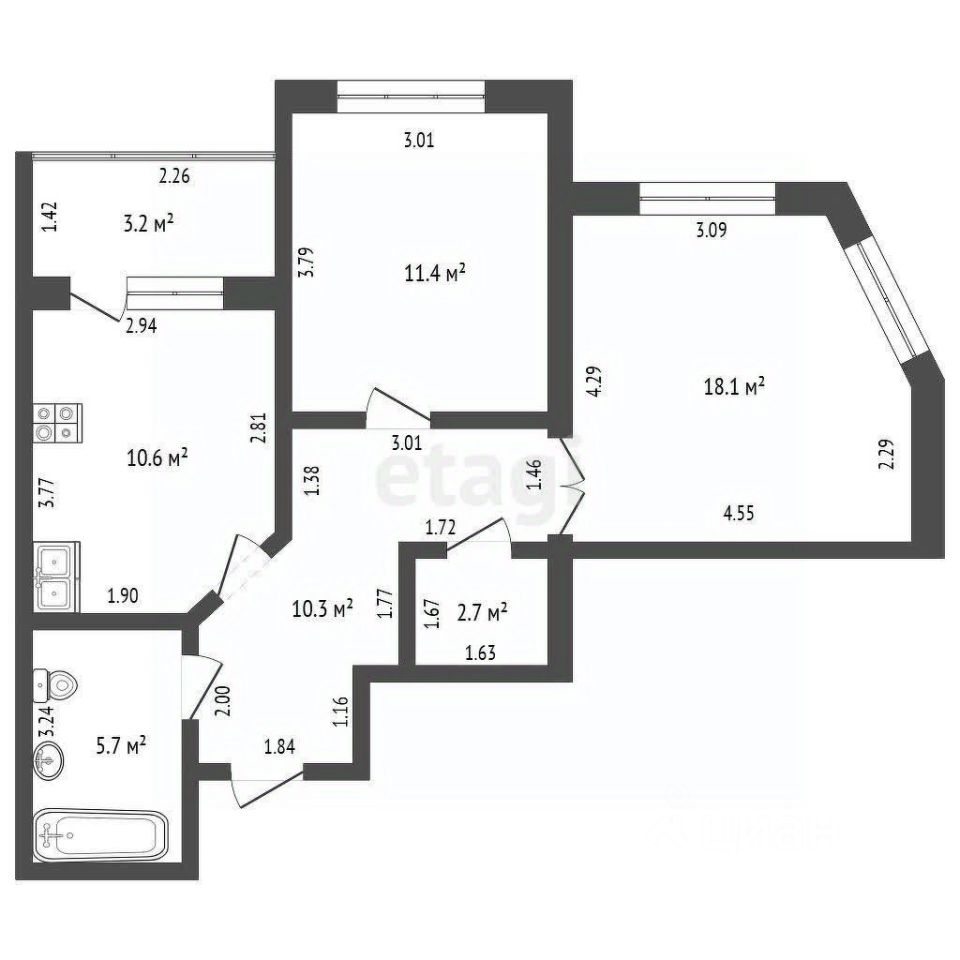 Зал - 18,1 кв.м. - очень светлый и уютный за счет двух окон. Можно реализовать смелые замыслы по дизайну и расстановки мебели.