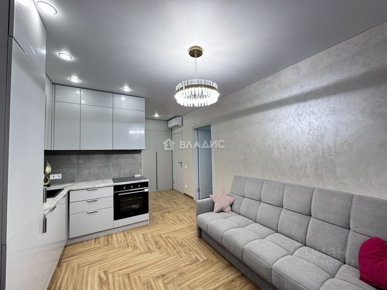 - В кухне - гостиной установлен кондиционер. Зона кухни оборудована современными фасадами: белые глянцевые шкафы, столешница под камень, встроенная техника (духовой шкаф, варочная панель, вытяжка, холодильник) — всё новое современное.