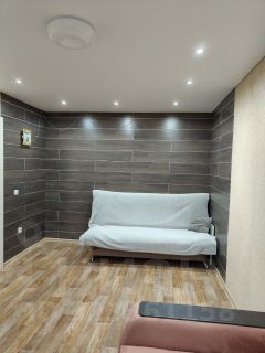 По всей квартире напольное покрытие - линолеум, натяжные потолки.
