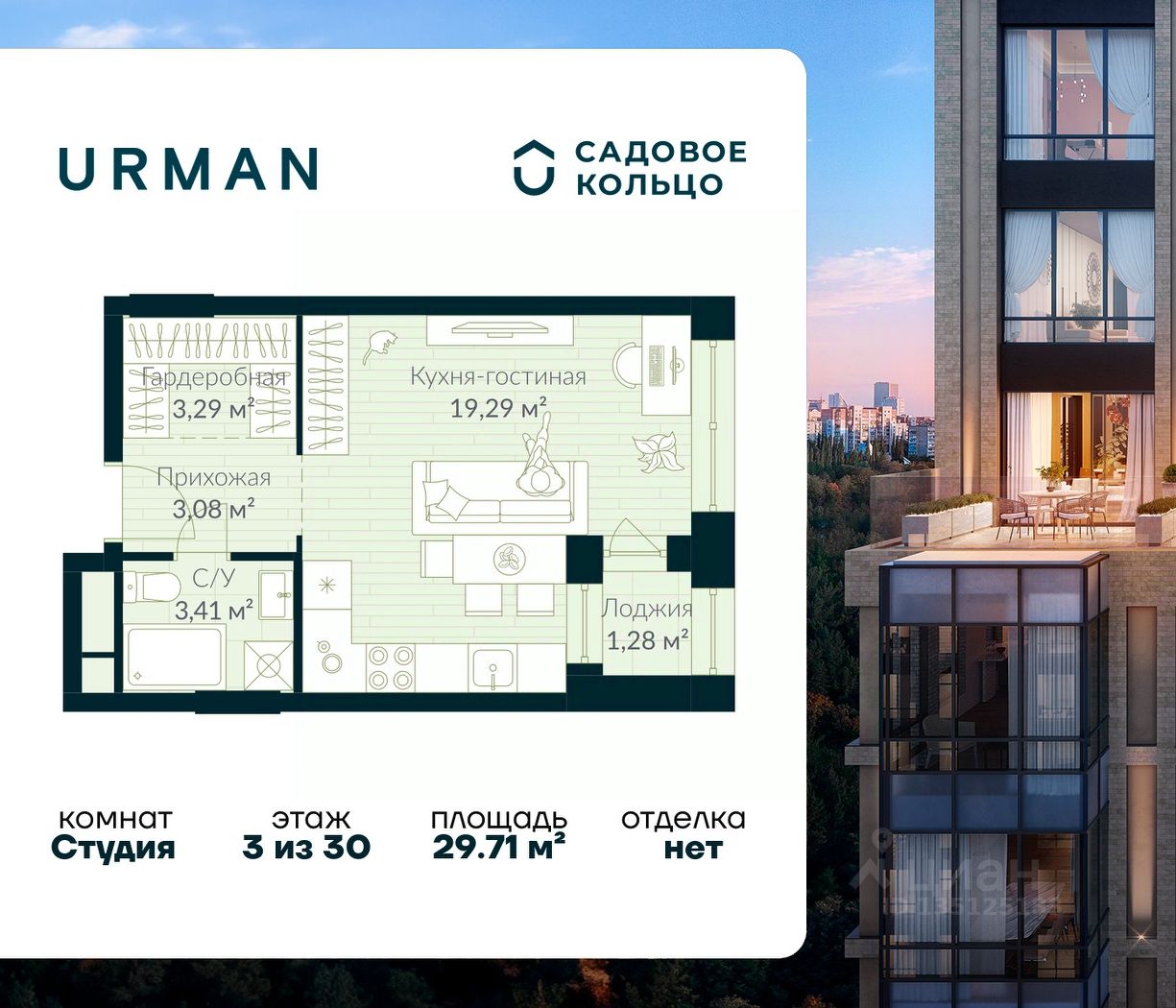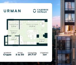 Продается квартира в ЖК Urman City студия на 3 этаже 30 этажного дома. Общая площадь: 29.71 кв.м. Высота потолков 3.4 м. Срок сдачи 2 квартал 2026 г. Эскроу-счет. Застройщик ГК "Садовое кольцо".