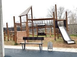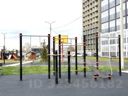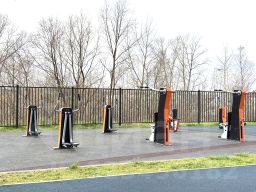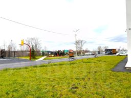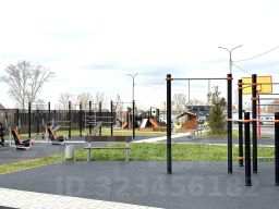 Большой зеленый двор с детскими площадками, каруселями, с тренажерами современными на все группы мышц, зоны отдыха со скамейками.