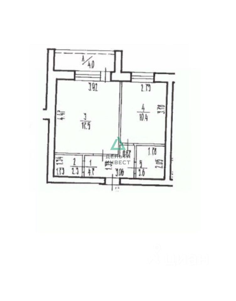 Общая площадь 42.5 кв.м., жилая 17.5 кв.м.,большая кухня 10.4 кв.м., высота потолков 2.5 м.