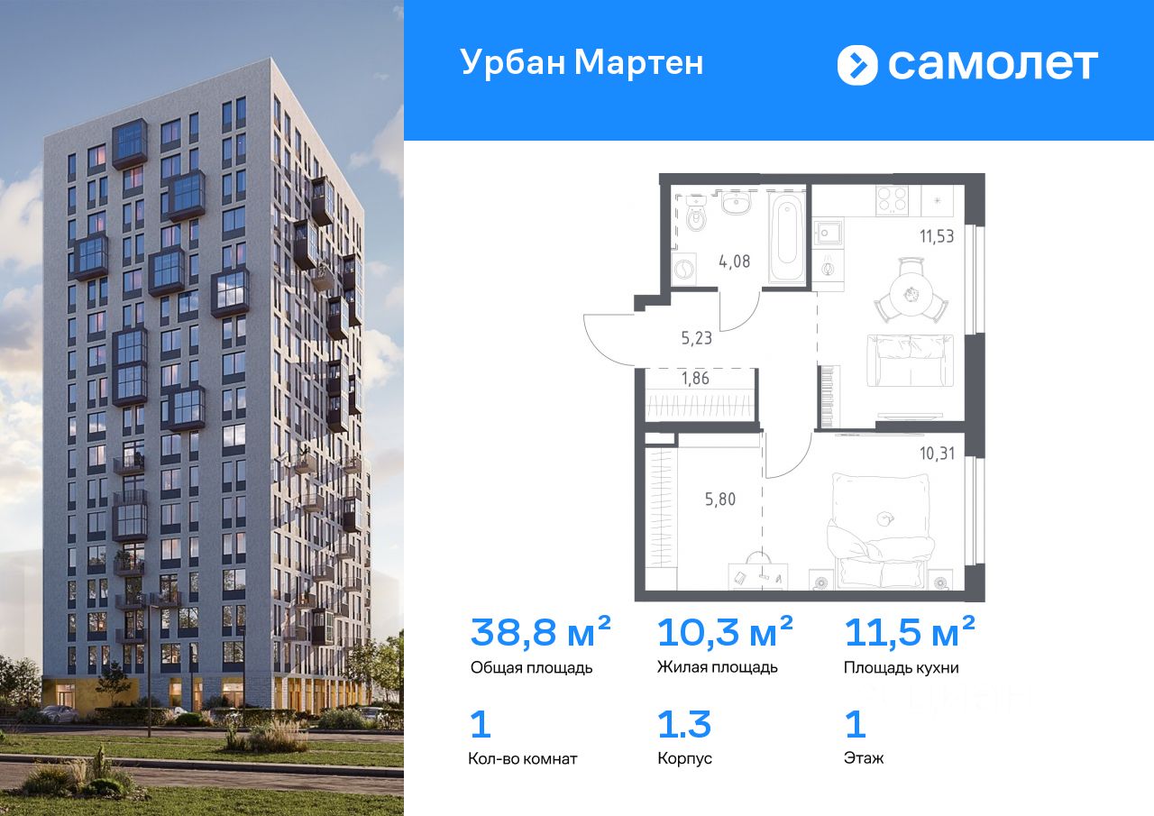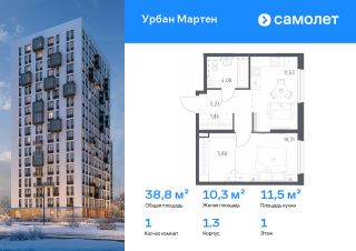 Строим кварталы для жизни с заботой о будущем. Предлагается 1-комнатная квартира комфорт-класса 38,81 кв.м в корпусе 1.3 на 1 этаже, в ЖК "Урбан Мартен"