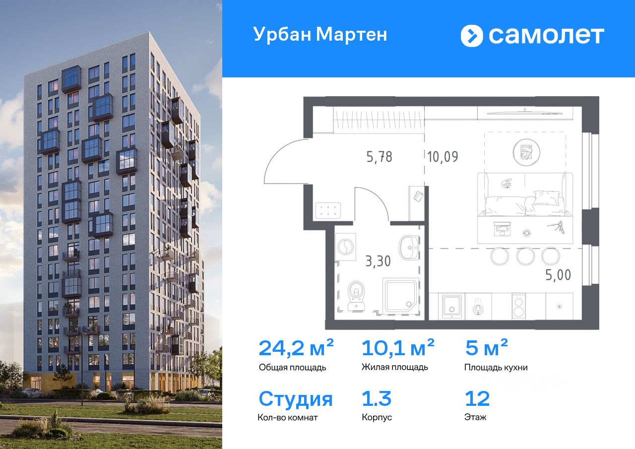 Строим кварталы для жизни с заботой о будущем. Предлагается квартира студия комфорт-класса 24,17 кв.м в корпусе 1.3 на 12 этаже, в ЖК "Урбан Мартен"