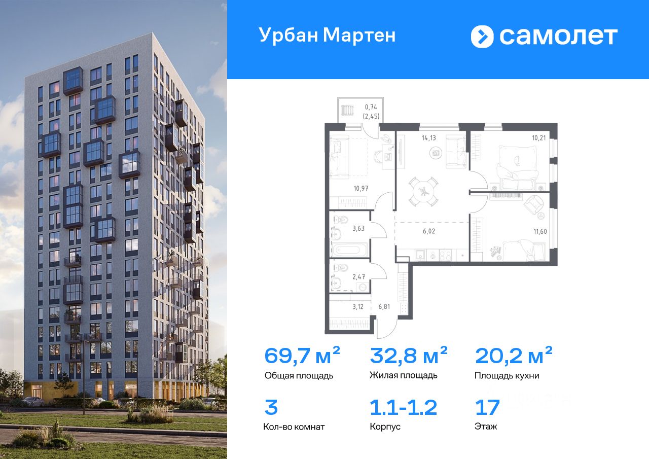 Строим кварталы для жизни с заботой о будущем. Предлагается 3-комнатная квартира комфорт-класса 69,7 кв.м в корпусе 1.1-1.2 на 17 этаже, в ЖК "Урбан Мартен"
