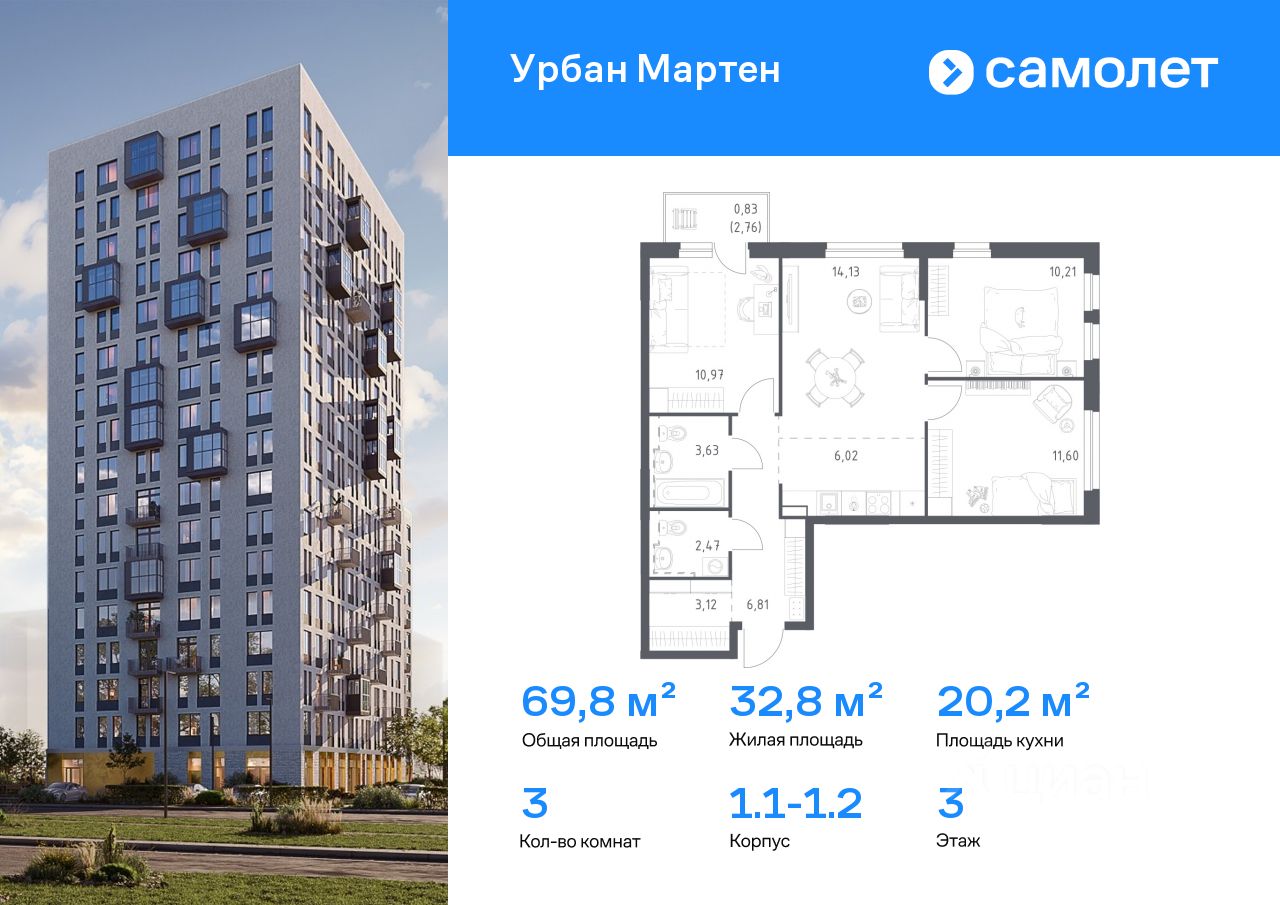 Строим кварталы для жизни с заботой о будущем. Предлагается 3-комнатная квартира комфорт-класса 69,79 кв.м в корпусе 1.1-1.2 на 3 этаже, в ЖК "Урбан Мартен"