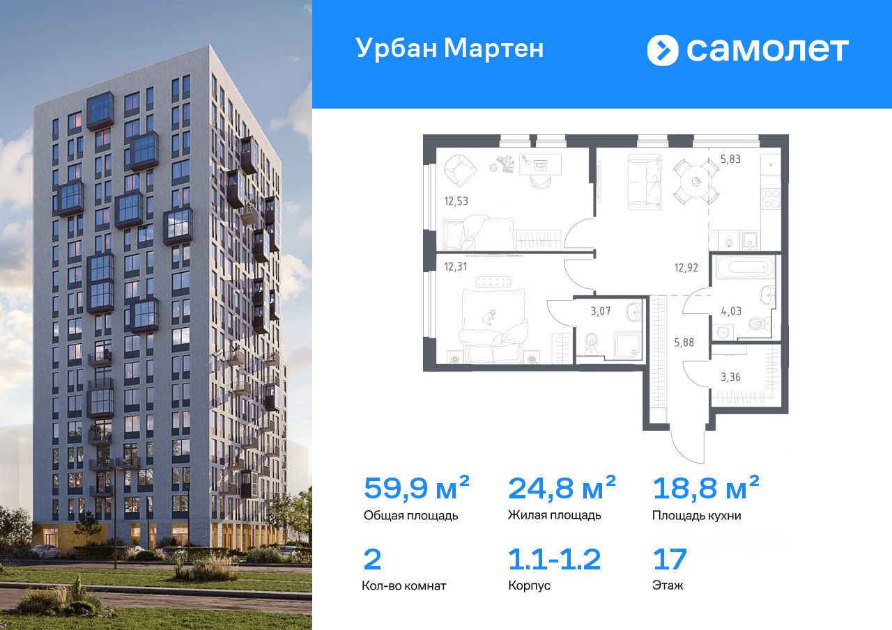 Строим кварталы для жизни с заботой о будущем. Предлагается 2-комнатная квартира комфорт-класса 59,93 кв.м в корпусе 1.1-1.2 на 17 этаже, в ЖК "Урбан Мартен"