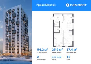 Строим кварталы для жизни с заботой о будущем. Предлагается 2-комнатная квартира комфорт-класса 54,15 кв.м в корпусе 1.1-1.2 на 11 этаже, в ЖК "Урбан Мартен"
