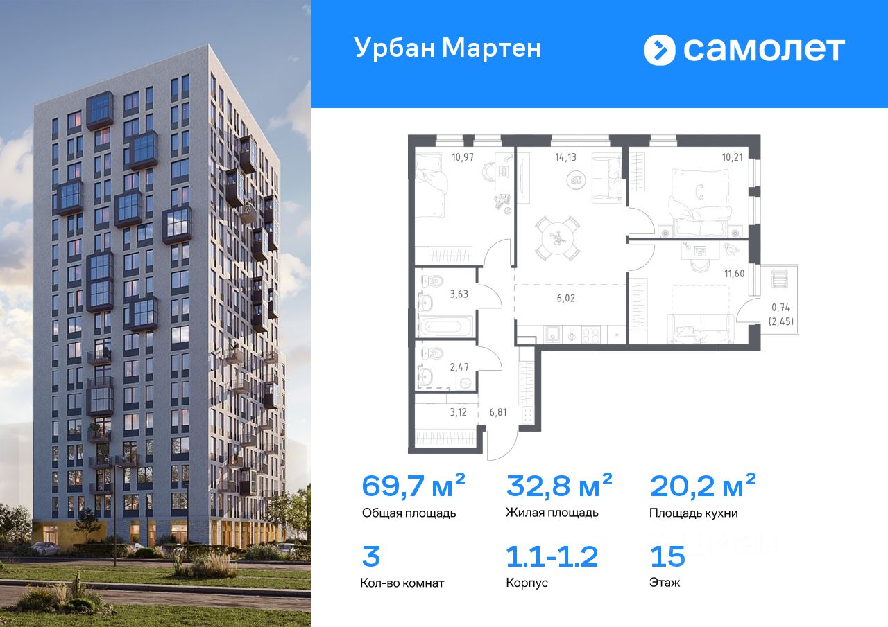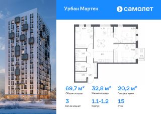Строим кварталы для жизни с заботой о будущем. Предлагается 3-комнатная квартира комфорт-класса 69,7 кв.м в корпусе 1.1-1.2 на 15 этаже, в ЖК "Урбан Мартен"