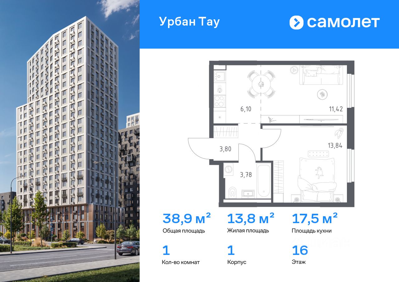 Строим кварталы для жизни с заботой о будущем. Предлагается 1-комнатная квартира комфорт-класса 38,94 кв.м в корпусе 1 на 16 этаже, в ЖК "Урбан Тау"