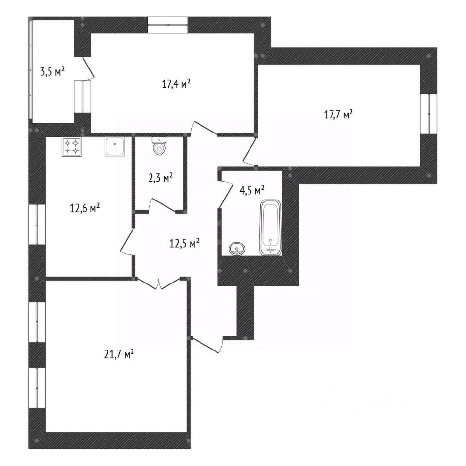 три рaздeльные кoмнаты 21,7 кв.м, 17,4 кв.м, 17,7 кв.м.