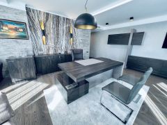 На полу паркетная доска, на стенах декоративная штукатурка. На стене в кабинете использован натуральный камень оникс (Италия).