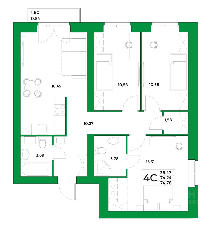 - жилая площадь 36.47 кв. м., кухня 18.45 кв. м..