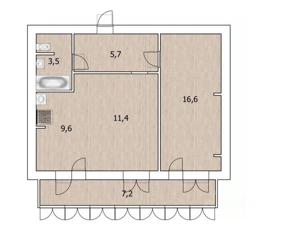 Квартира общей площадью 46,8 м² +2,, балкон , комнаты 16,6 м² и 11,4 м², кухня — 9,6 м².