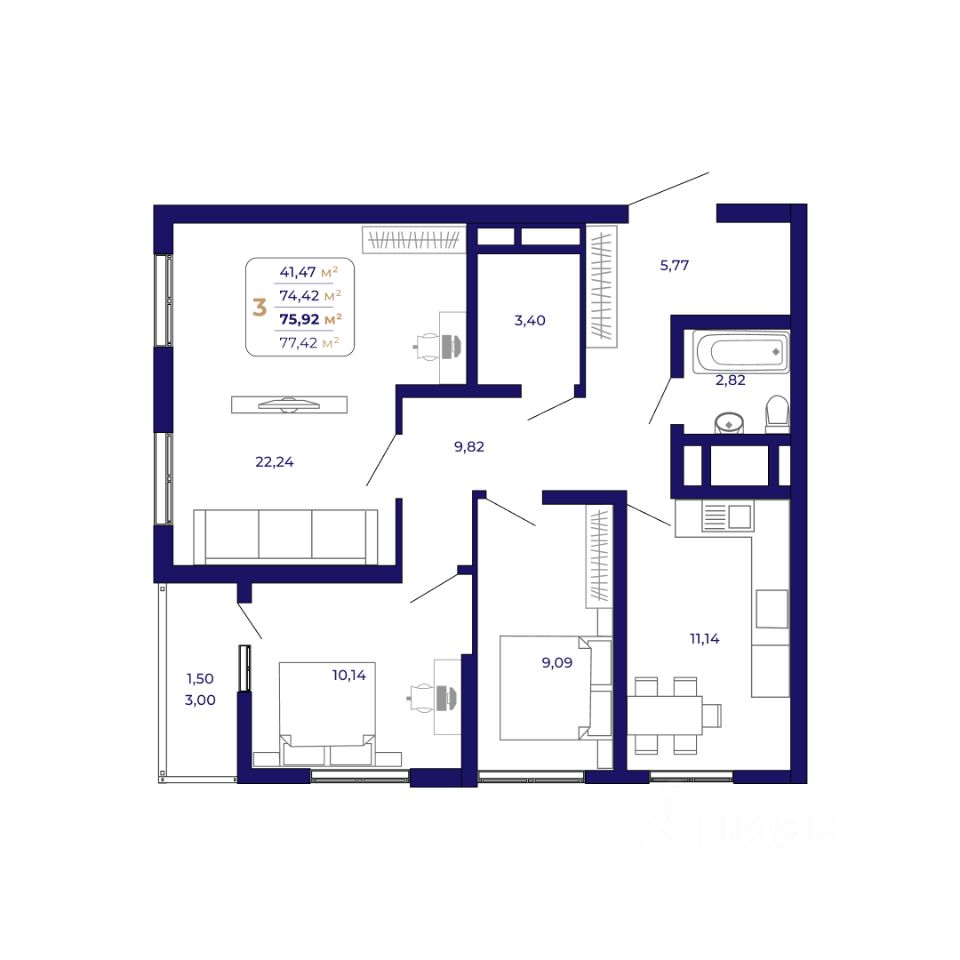 Продаётся 3-комнатная квартира в строящемся доме (Литер 6 (квартал 7)), срок сдачи: IV-кв. 2026, общей площадью 75.92 кв.м., на 5 этаже. Современный жилой комплекс "Паруса"
