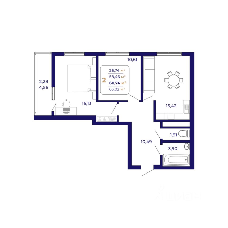 Продаётся 2-комнатная квартира в строящемся доме (Литер 5 (квартал 7)), срок сдачи: I-кв. 2027, общей площадью 60.74 кв.м., на 5 этаже. Современный жилой комплекс "Паруса"