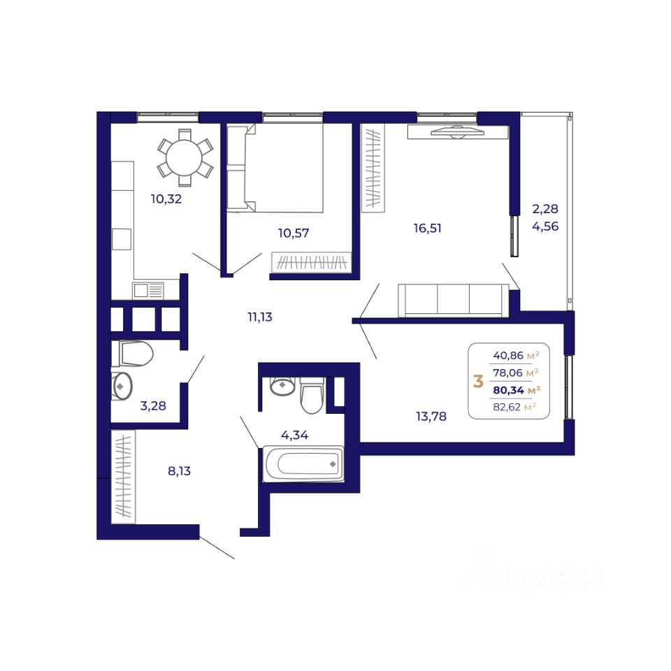 Продаётся 3-комнатная квартира в строящемся доме (Литер 5 (квартал 7)), срок сдачи: I-кв. 2027, общей площадью 80.34 кв.м., на 6 этаже. Современный жилой комплекс "Паруса"