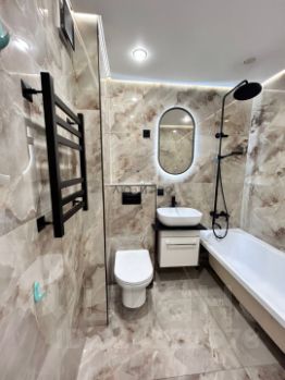 В ванной уложена современная плитка и теплый пол. Это создает чувство уюта и комфорта. Установлен сенсорный полотенцесушитель и электрическая вытяжка. Все для вашего удобства.