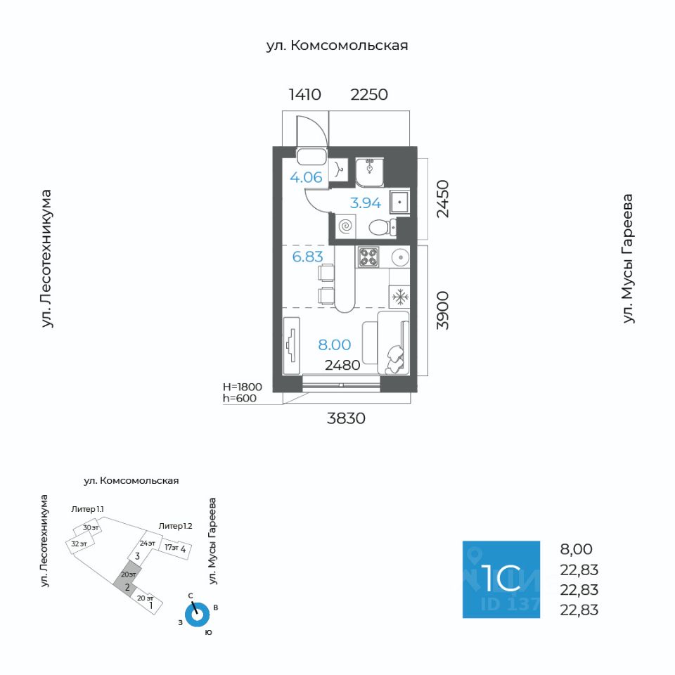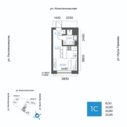 Общая площадь 22.83кв.м.;