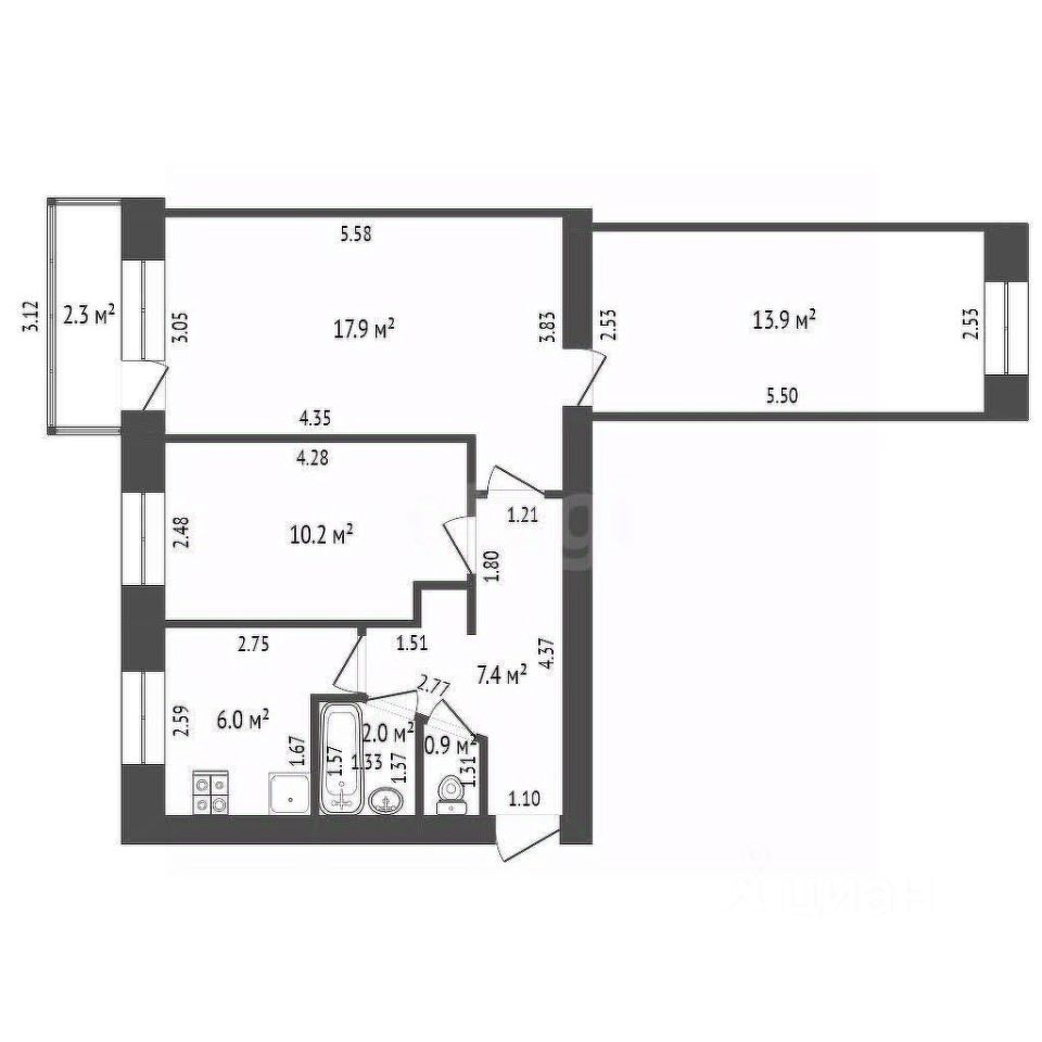 Общая площадь: 58,3 кв. м.