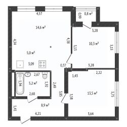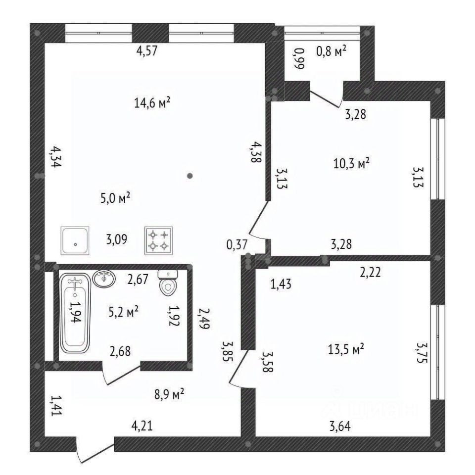 три изолированные комнаты площадью 14.6 кв.м, 13.5 кв.м и 10.3 кв.м, кухню в 5 кв.м,