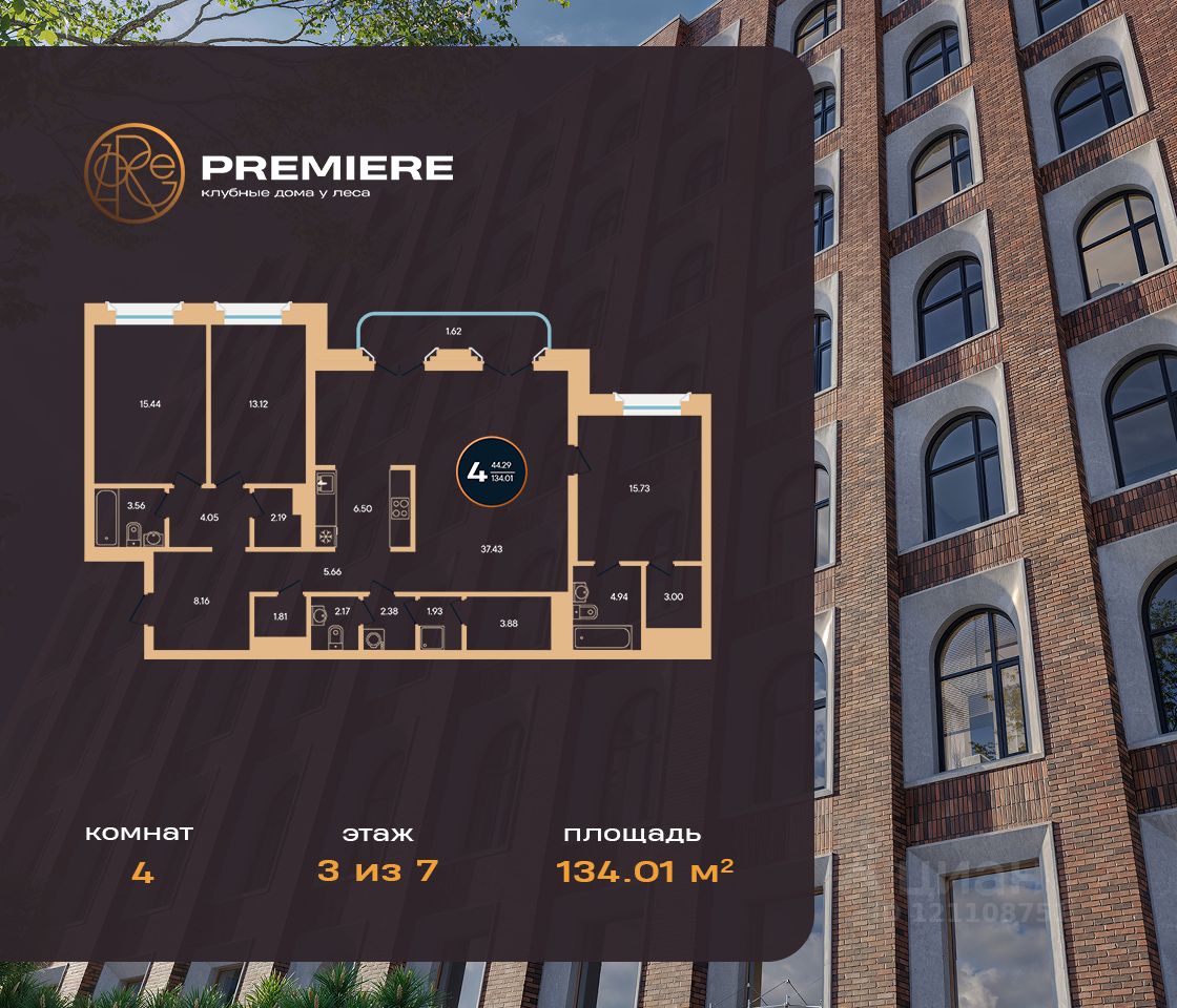 Продается 4-к-комнатная квартира в ЖК Зорге. Премьер от ГК "Жилстройинвест". 3-й этаж 8-этажного жилого дома, общая площадь 134.01 кв.м., жилая площадь 44.29 кв.м.