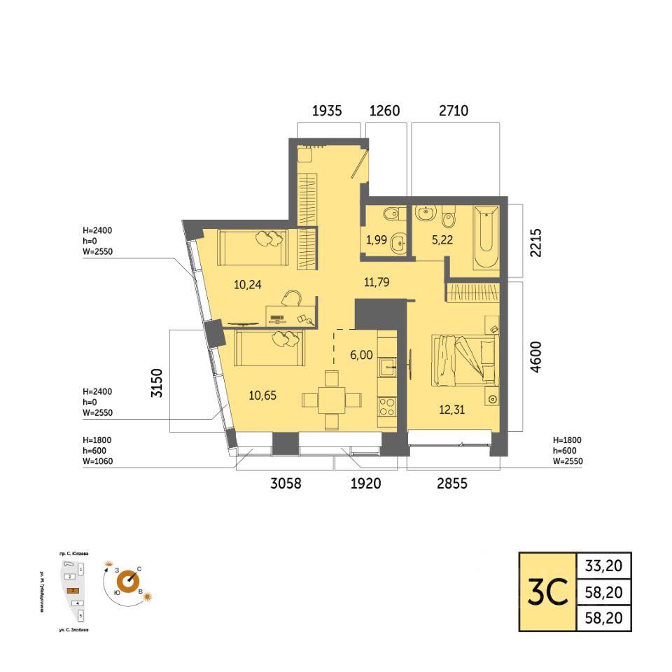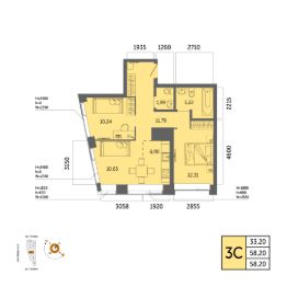 Общая площадь 58.20кв.м.;