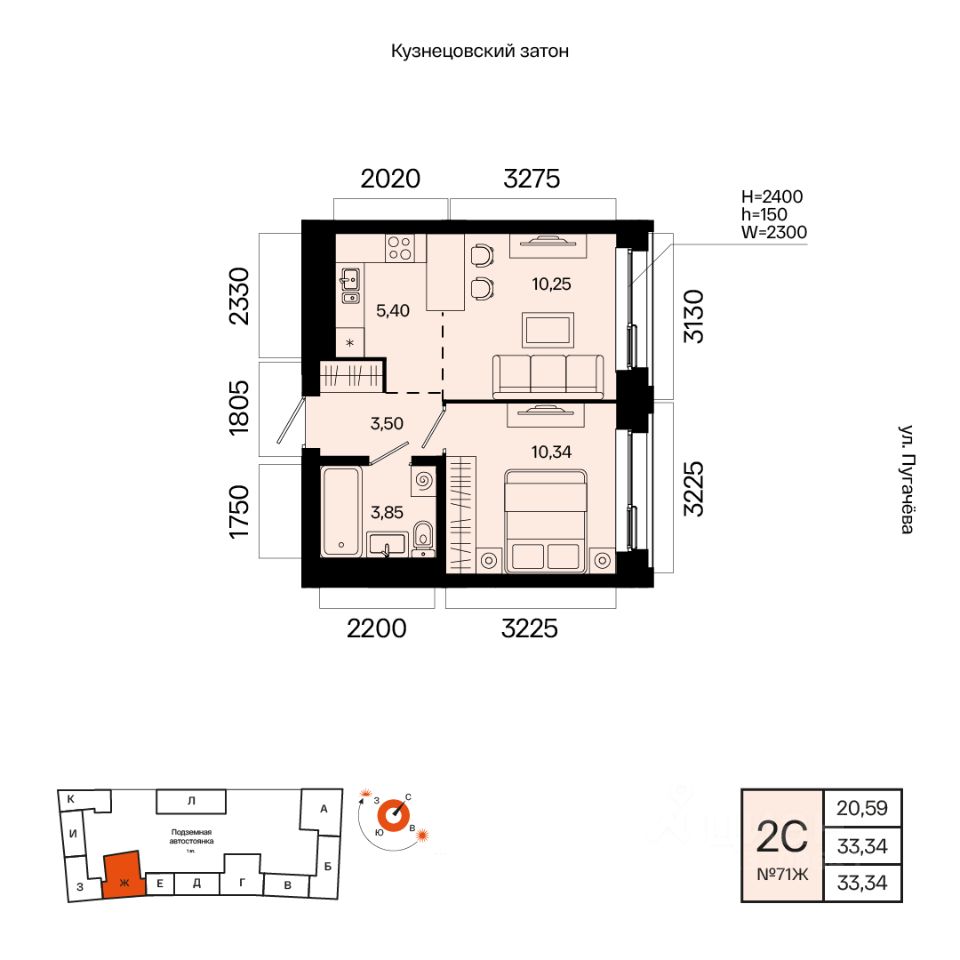 Общая площадь 33.34кв.м.;
