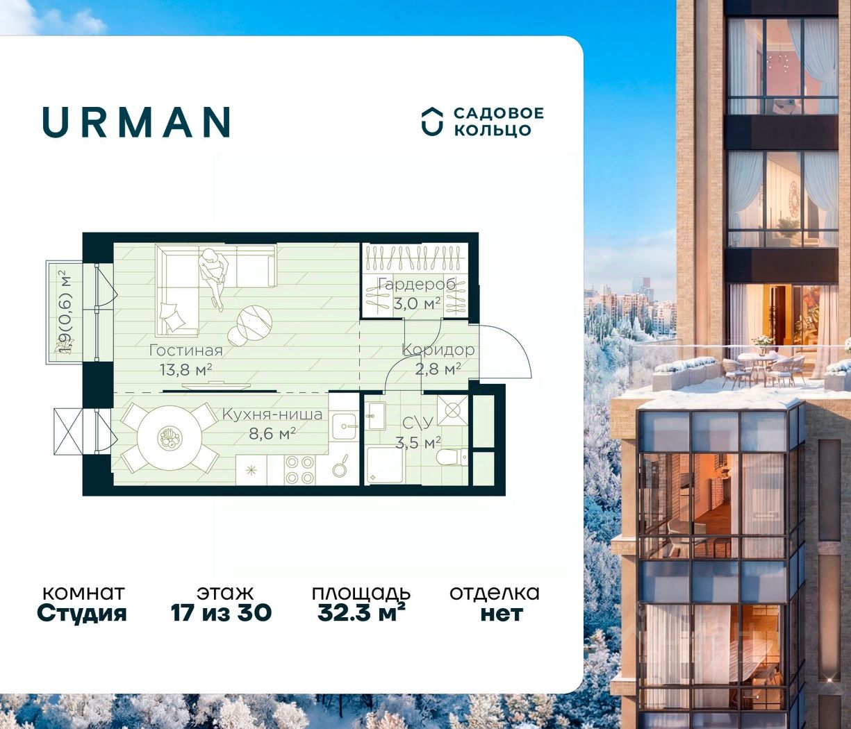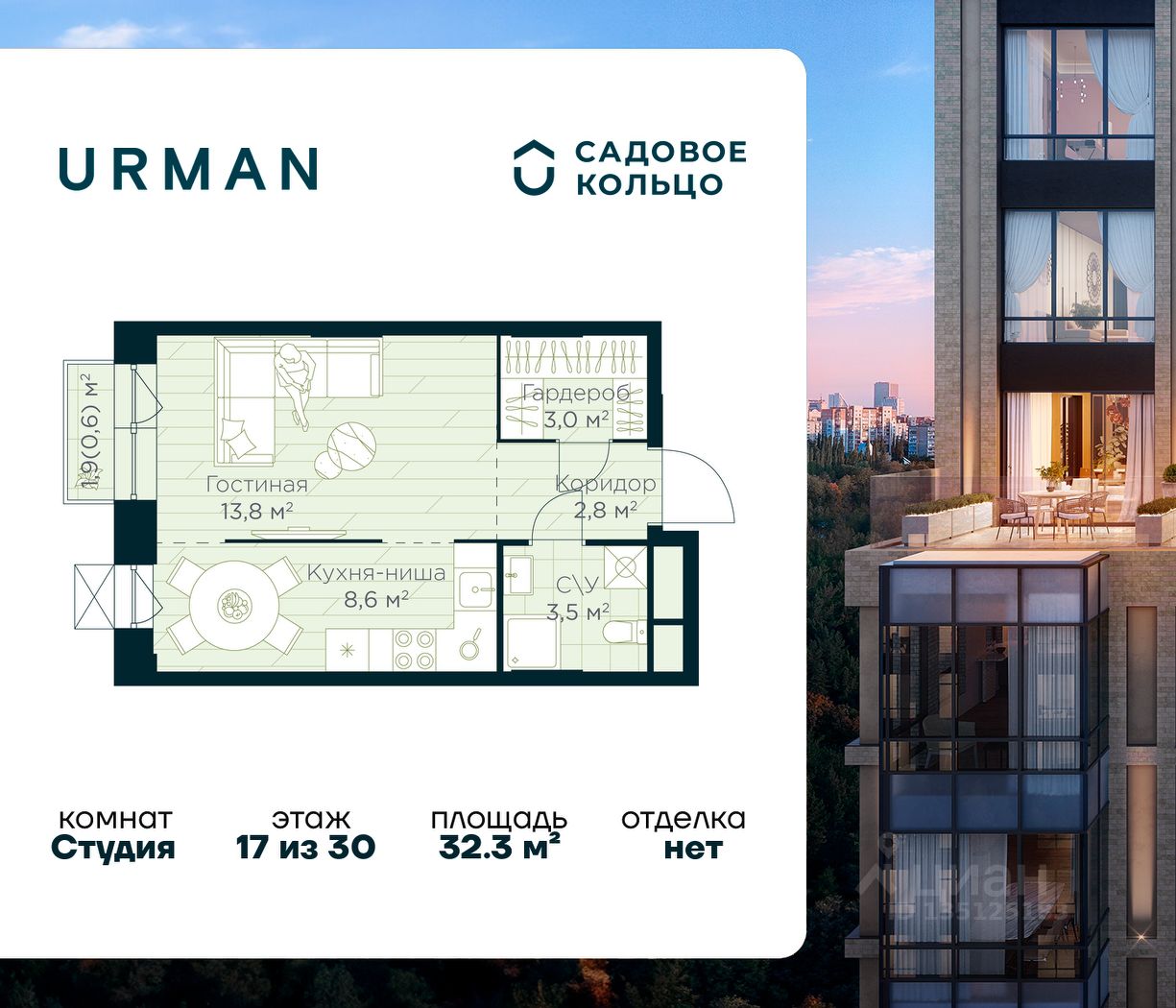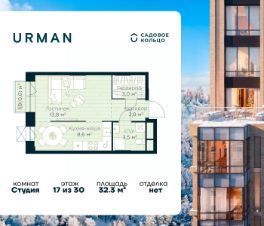 Продается квартира в ЖК Urman City студия на 17 этаже 30 этажного дома. Общая площадь: 32.3 кв.м. Высота потолков 2.95 м. Срок сдачи 1 квартал 2028 г. Эскроу-счет. Застройщик ГК "Садовое кольцо".