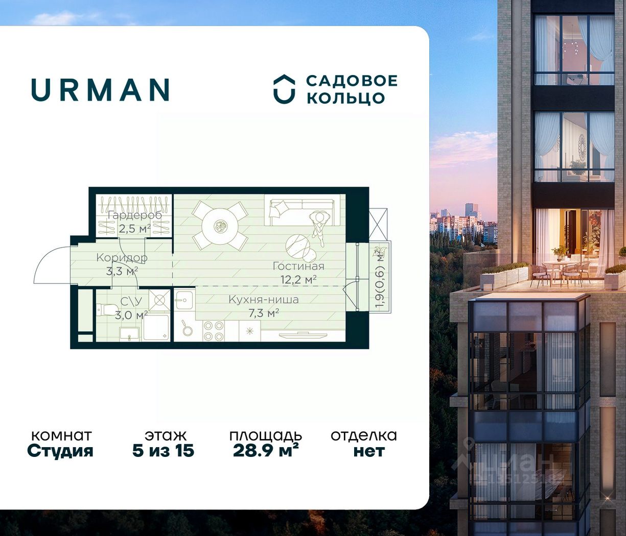 Продается квартира в ЖК Urman City студия на 5 этаже 15 этажного дома. Общая площадь: 28.9 кв.м. Высота потолков 2.95 м. Срок сдачи 1 квартал 2028 г. Эскроу-счет. Застройщик ГК "Садовое кольцо".