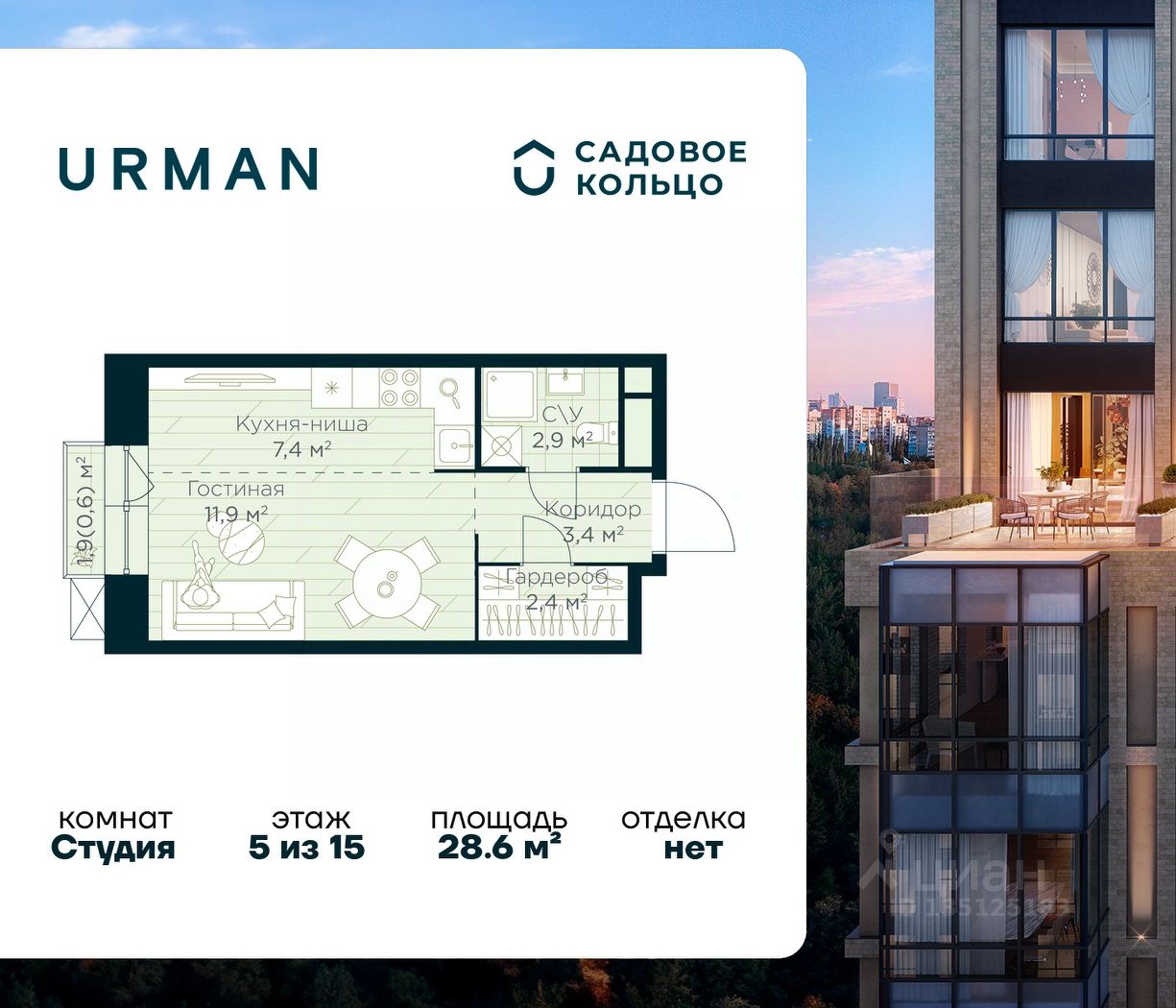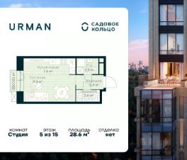 Продается квартира в ЖК Urman City студия на 5 этаже 15 этажного дома. Общая площадь: 28.6 кв.м. Высота потолков 2.95 м. Срок сдачи 1 квартал 2028 г. Эскроу-счет. Застройщик ГК "Садовое кольцо".