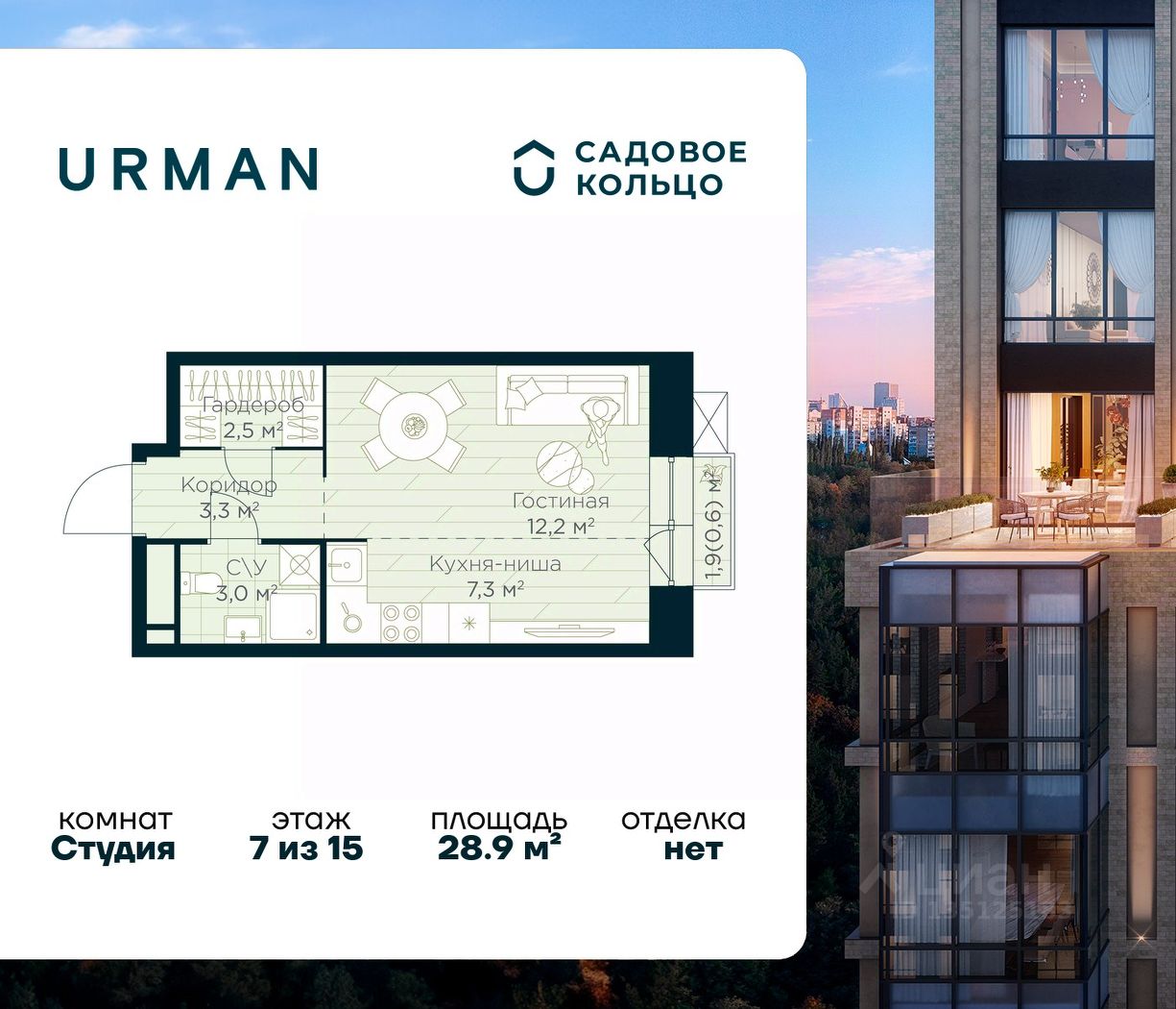Продается квартира в ЖК Urman City студия на 7 этаже 15 этажного дома. Общая площадь: 28.9 кв.м. Высота потолков 2.95 м. Срок сдачи 1 квартал 2028 г. Эскроу-счет. Застройщик ГК "Садовое кольцо".