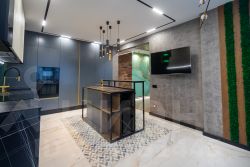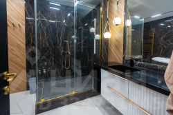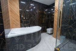 Элитные материалы: Дорогой керамогранит, дизайнерская отделка, качественная сантехника, теплый пол по всей площади.