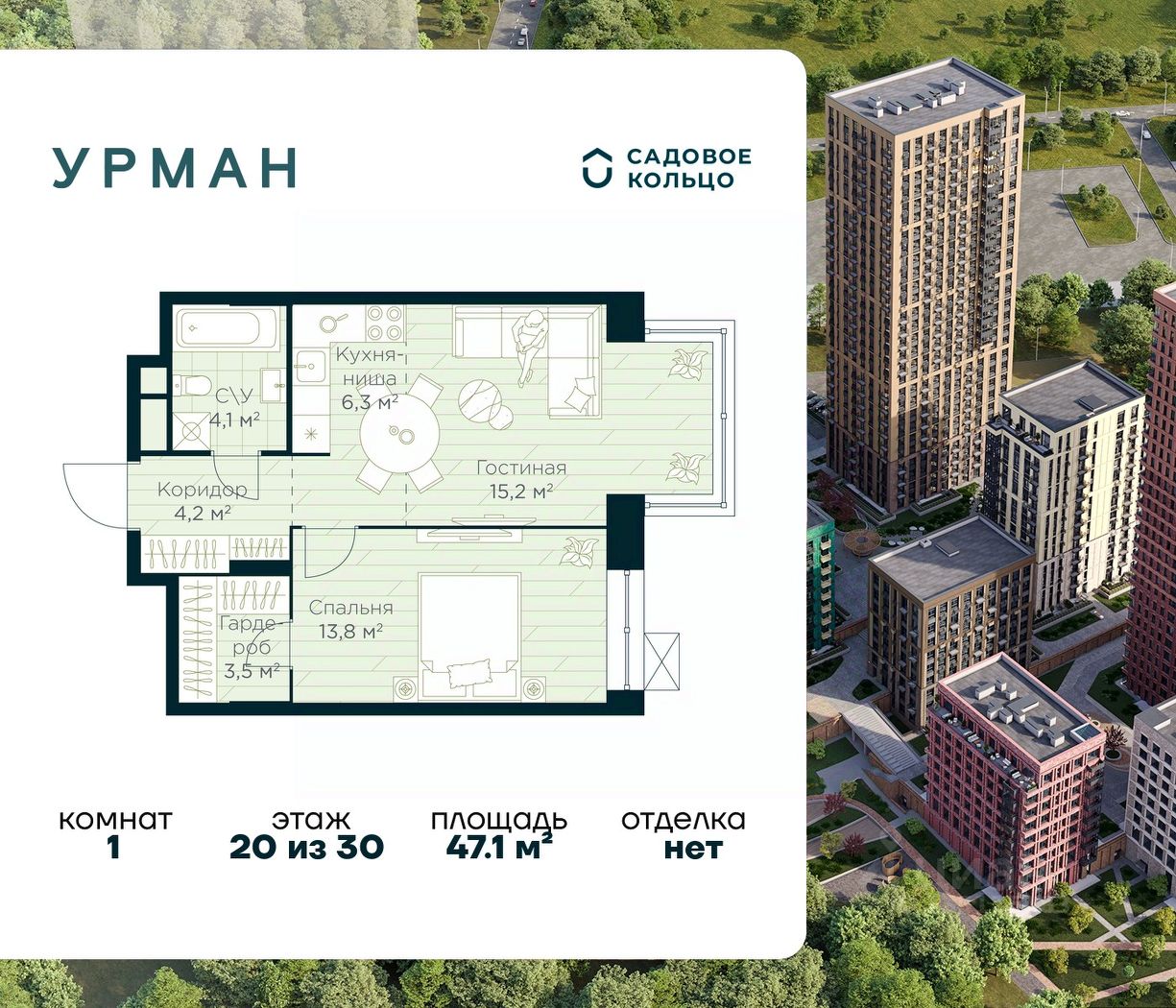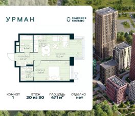 Продается квартира в ЖК Urman City с 1 спальней на 20 этаже 30 этажного дома. Общая площадь: 47.1 кв.м. Высота потолков 2.95 м. Срок сдачи 1 квартал 2028 г. Эскроу-счет. Застройщик ГК "Садовое кольцо".