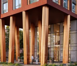 - Узнаваемая архитектура. Эстетичный дуэт: башня высотой 100 метров и 12-этажная секция с монументальными медными колоннами.