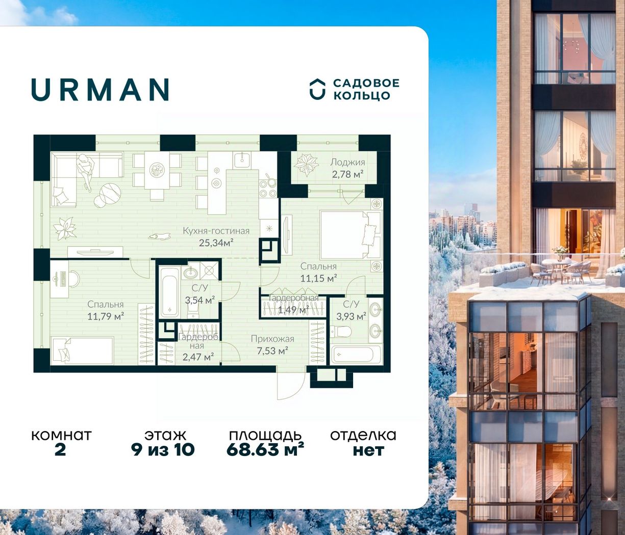 Продается квартира в ЖК Urman City с 2 спальнями на 9 этаже 10 этажного дома. Общая площадь: 68.63 кв.м. Высота потолков 3.4 м. Срок сдачи 2 квартал 2026 г. Окна выходят на 2 стороны. Вид во двор. Мастер-спальня. Эскроу-счет. Застройщик ГК "Садовое кольцо".