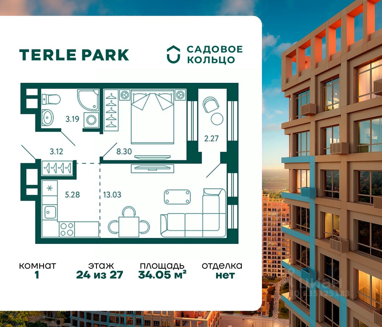 Продается квартира в ЖК Terle Park с 1 спальней на 24 этаже 27 этажного дома. Общая площадь: 34.05 кв.м. Высота потолков 2.95 м. Срок сдачи 4 квартал 2025 г. Вид на лес. Вид на реку. С отделкой White box. Эскроу-счет. Застройщик ГК "Садовое кольцо".