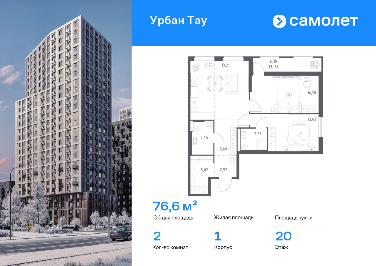 Строим кварталы для жизни с заботой о будущем. Предлагается 2-комнатная квартира комфорт-класса 76,64 кв.м в корпусе 1 на 20 этаже, в ЖК "Урбан Тау"
