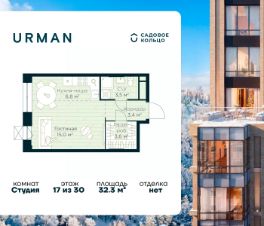 Продается квартира в ЖК Urman City студия на 17 этаже 30 этажного дома. Общая площадь: 32.3 кв.м. Высота потолков 2.95 м. Срок сдачи 1 квартал 2028 г. Эскроу-счет. Застройщик ГК "Садовое кольцо".