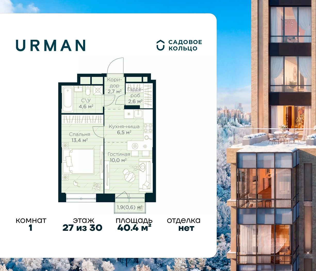 Продается квартира в ЖК Urman City с 1 спальней на 27 этаже 30 этажного дома. Общая площадь: 40.4 кв.м. Высота потолков 2.95 м. Срок сдачи 1 квартал 2028 г. Эскроу-счет. Застройщик ГК "Садовое кольцо".