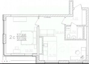 * *Планировка:* Кухня 5,7 кв.м., гостиная 18,6 кв.м., спальня 19 кв.м., совмещенный санузел 3,7 кв.м.