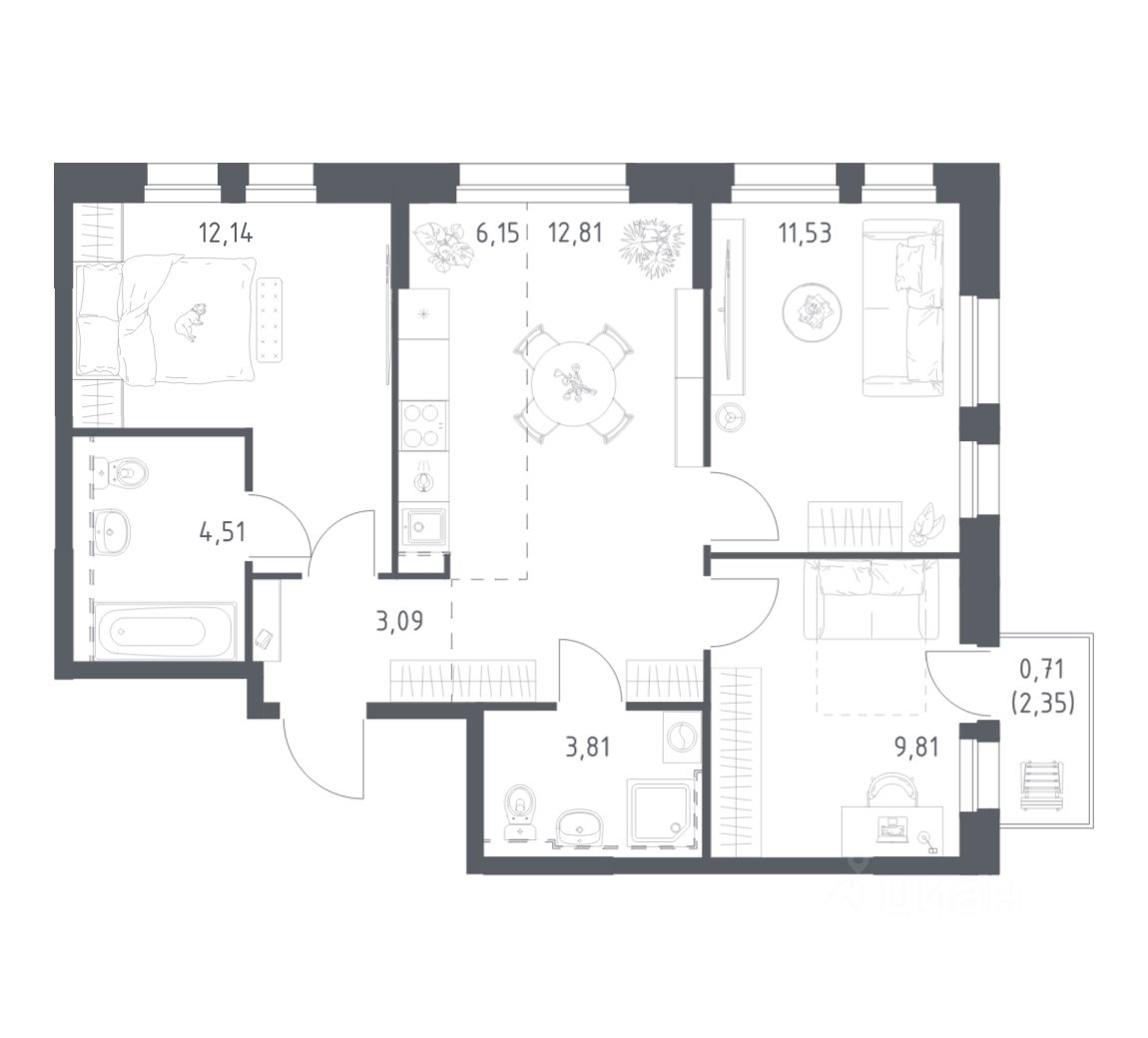 Строим кварталы для жизни с заботой о будущем. Предлагается 3-комнатная квартира комфорт-класса площадью 64.56 кв.м в корпусе 2КВ на 9-м этаже, в жилом комплексе "Сабанеева 125".