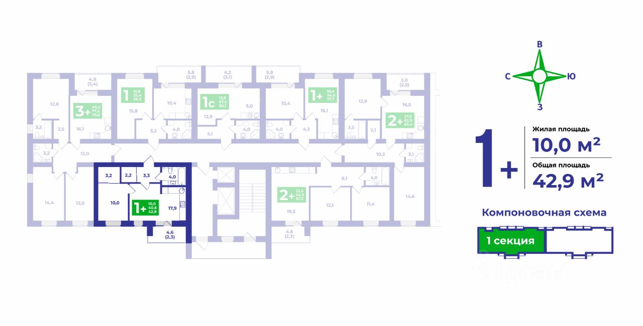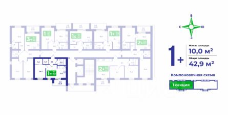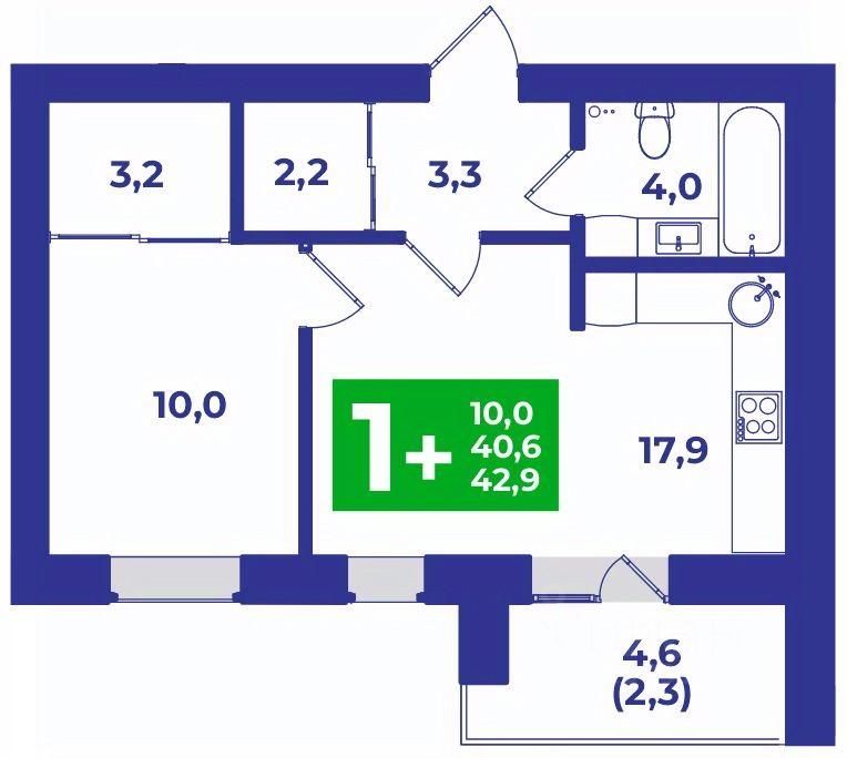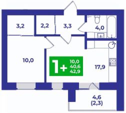 Просторная евро-однокомнатная квартира для пары. В прихожей ниша для гардероба 2,2 кв.м. Санузел площадью 4 кв.м., куда поместится и ванна, и стиральная машина. Отдельная спальня 10 кв.м. с нишей для гардероба 3,2 кв.м. Широкая кухня-гостиная 17,9 кв.м. с выходом на лоджию, откуда открывается вид на живописные закаты.