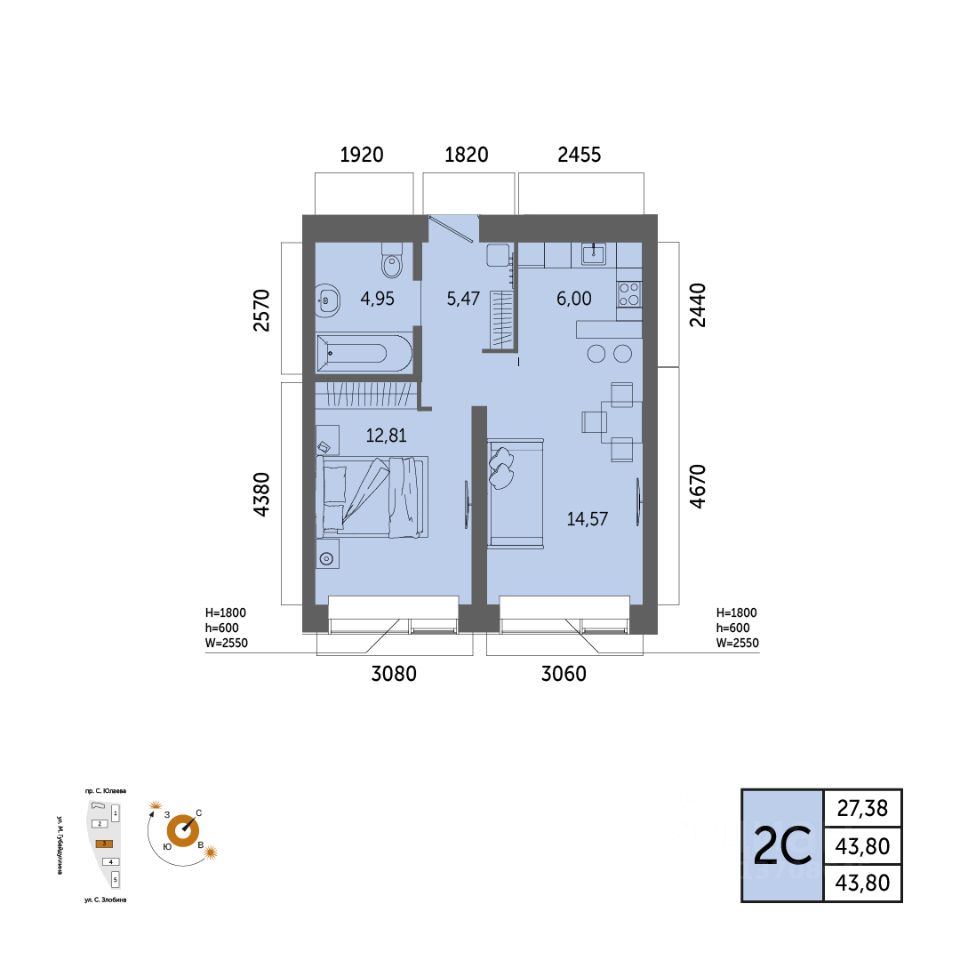 Общая площадь 43.80кв.м.;