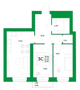 - жилая площадь 19.64 кв. м., кухня 17.22 кв. м..